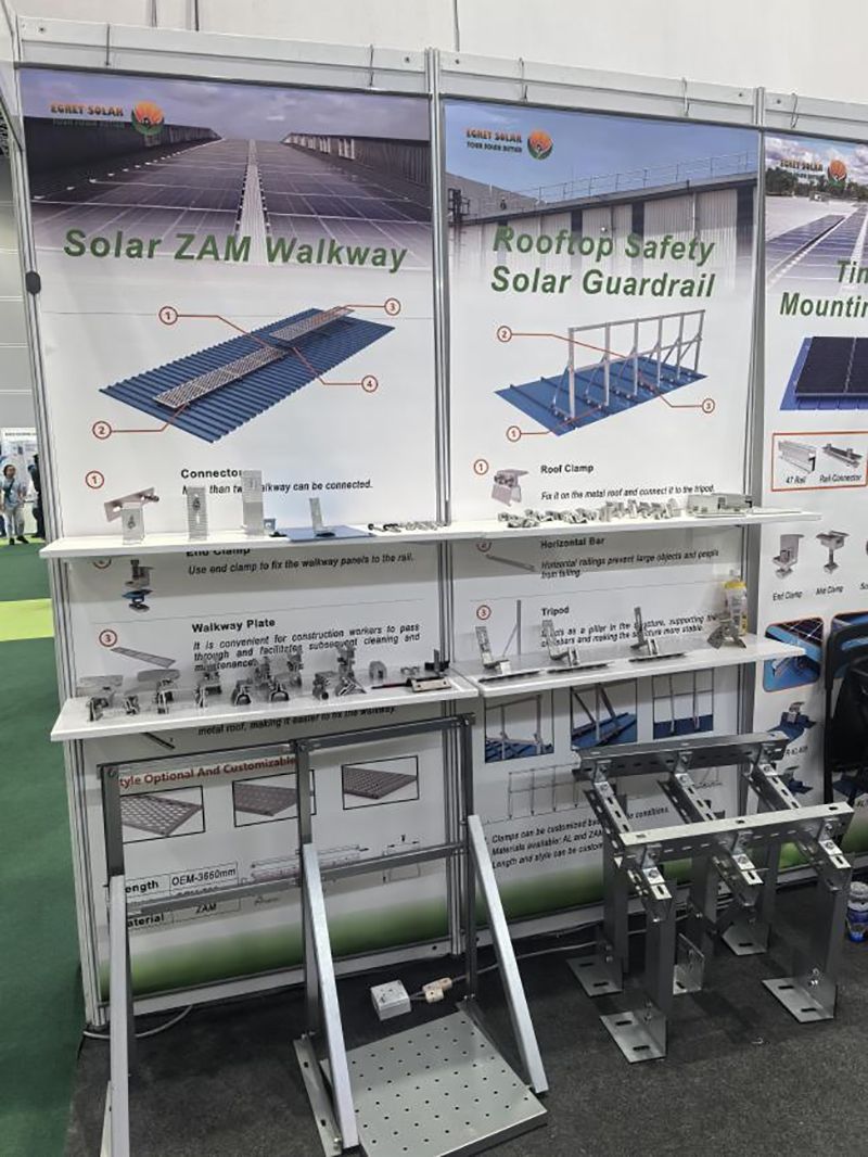 Ing pameran kasebut, kita nuduhake sawetara aksesoris Rooftop, kalebu clamptop, pancing, lan sikil sikil. Pelanggan bisa milih kombinasi beda adhedhasar lingkungan instalasi. Kaki lik utawa l digunakake kanggo kothak baja sing ditutupi karo warna, dene surya hook jubin digunakake kanggo jubin keramik. Kita uga bisa ngatur clamping adhedhasar model jubin baja sing dilapis warna utawa ngluwihi lengen pancing kanggo cocog karo panggunaan situs.